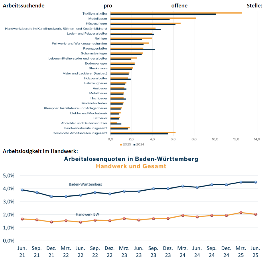 Der Arbeitsmarkt im baden-württembergischen Handwerk zeigte sich trotz gedämpfter wirtschaftlicher Lage weiter robust. Die Arbeitslosenquote ging auf zwei Prozent zurück. Gleichzeitig stieg die Zahl der offenen Stellen leicht. Insgesamt kamen 1,9 Arbeitssuchende auf eine offene Stelle (Juni 2024 1,7). Damit stieg die Zahl der Arbeitssuchenden mit Interesse am Handwerk im Vergleich mit Juni 2024 im Durchschnitt stärker als die offenen Stellen.