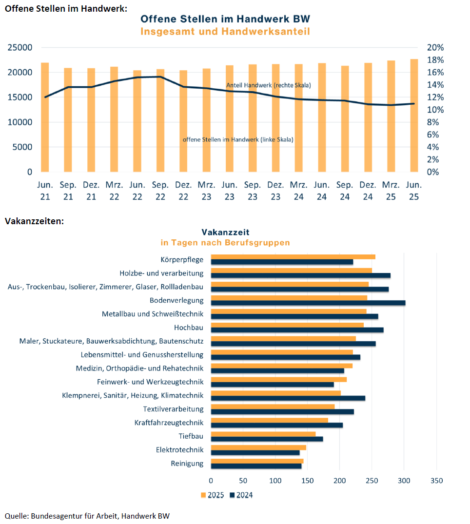 Die Vakanzzeit sank ebenso um sechs auf 142 Tage. Vor allem in bau- und baunahen Berufen sowie im Kfz-Bereich sanken die Wartezeiten bis zur Einstellung deutlich. Die sinkende Arbeitslosenquote und die Zunahme der offenen Stellen könnten weitere Indizien dafür sein, dass eine konjunkturelle Wende in Sicht ist. Gleichzeitig stieg die Zahl der Arbeitssuchenden, aber die Wartezeit ging zurück. Das zeigt: Fachkräfte im Handwerk sind schon derzeit gut gesucht. Die Betriebe können zusätzliche Fachkräfte gut aufnehmen.